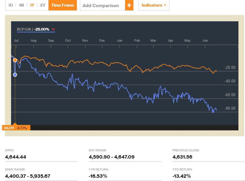 Enquanto muitos tentam aproveitar os dias de sol e ir à praia, outros preferem ver os jogos de futebol do euro. Enquanto isso, o BCP continua o seu caminho lento e agónico para a decadência. A queda do BCP é estrondosa. Os media falam de dias de queda de 5 a 10% como se fosse uma normalidade. Parece que já se habituaram e essa anormalidade virou normal.