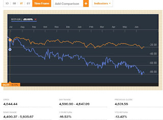 A azul está o BCP e a castanho o indice português. O BCP caiu muito mais do que o indice português o que mostra bem o estado atual do banco. Algo de muito grave se passou no banco. Algo de muito grave se passa no banco.
